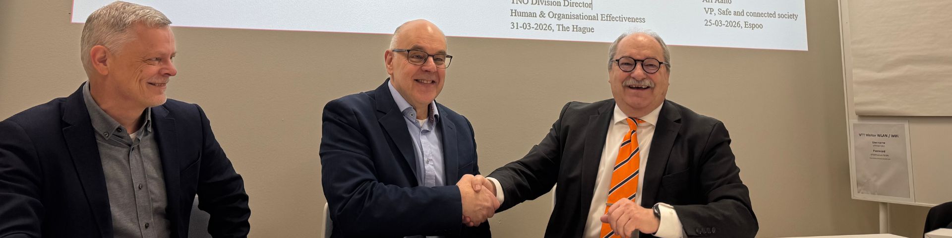 TNO en VTT Technical Research Centre of Finland gaan hun samenwerking op het gebied van defensie verder vormgeven en uitbreiden. Een intentieverklaring (Memorandum of Understanding) hierover werd onlangs ondertekend door vertegenwoordigers van beide organisaties. Sauli Eloranta, VP Defence, en Ari Aalto, VP Safe and Connected Society, tekenden namens VTT en namens TNO Hendrik-Jan van Veen, managing-director, en Louk Absil, Programme Director Defence, Safety & Security.