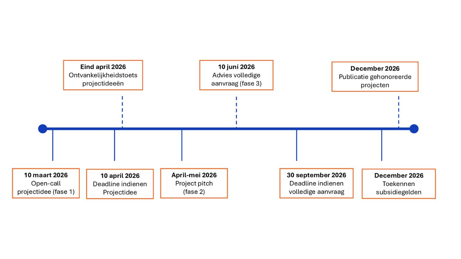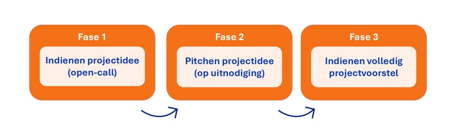 De open-call voor projectideeën (fase 1) opent op dinsdag 10 maart 2026. Projectideeën dienen uiterlijk vrijdag 10 april 2026 bij de programmagroep te zijn aangeleverd. Medio april worden de indieners van de kansrijke projectideeën uitgenodigd om hun projectidee te pitchen en enkele vragen te stellen/beantwoorden (fase 2).